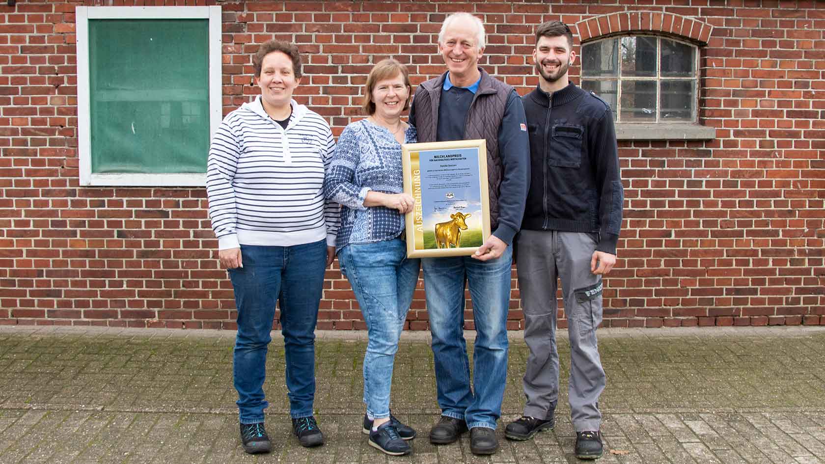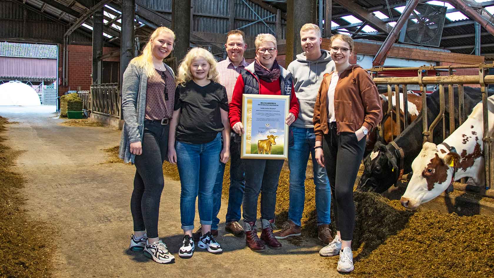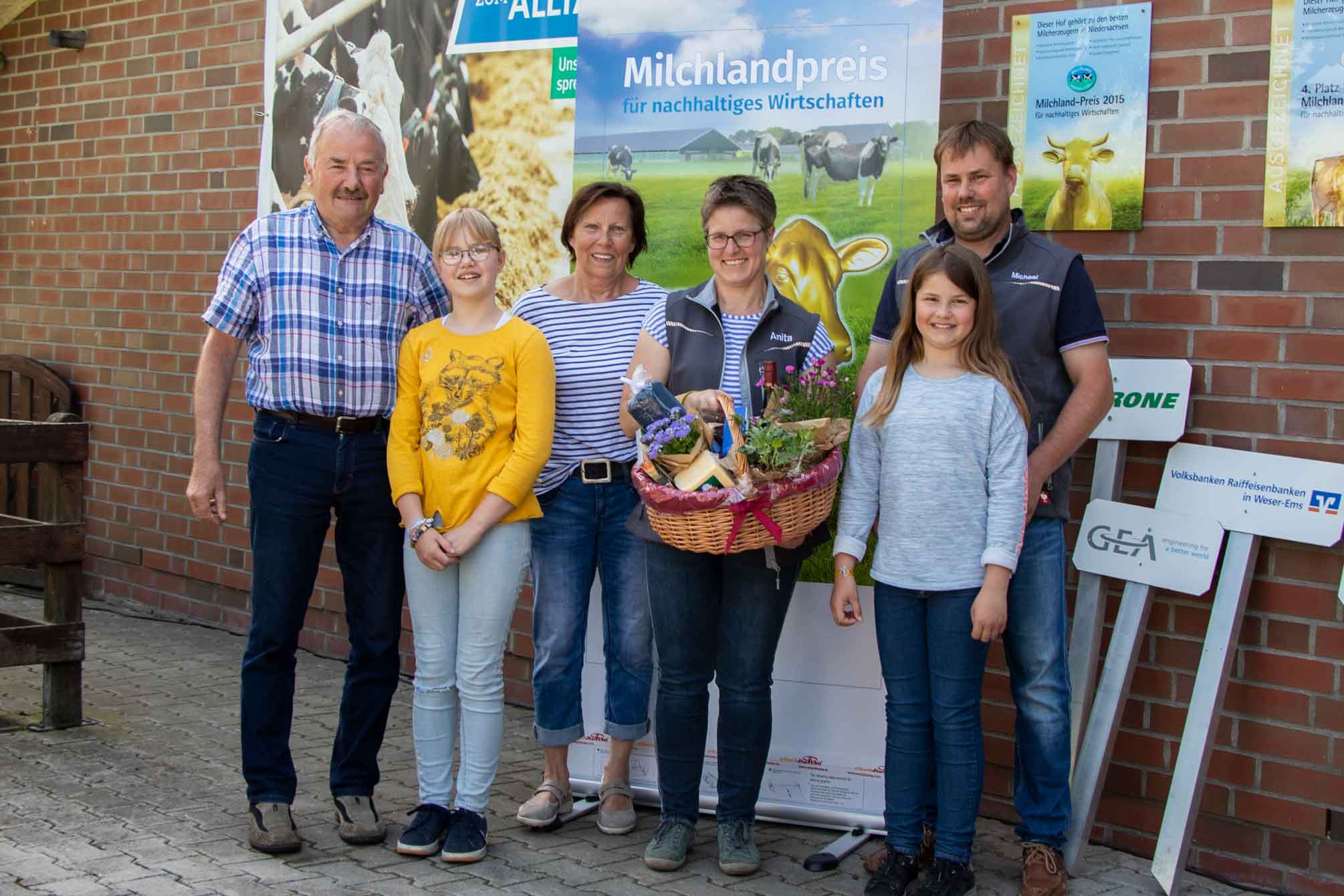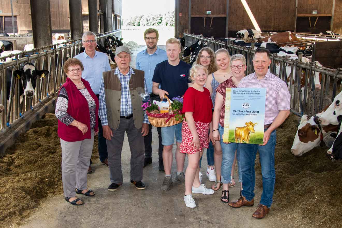 Karin und Dirk Lüschen-Strudthoff bewirtschaften in Hatten-Tweelbäke Ost (Landkreis Oldenburg) mit ihren Kindern Annika, Finn, Madita und Insa einen insgesamt 117 Hektar großen Betrieb. Auf dem Hof werden 135 Milchkühe und 130 weibliche Nachzuchttiere gehalten. Die Herde erbringt eine sehr gute Milchleistung von rund 11.630 Kilogramm pro Kuh und Jahr bei einem Fettgehalt von 3,82 Prozent und einem Eiweißgehalt von 3,43 Prozent. Die Milch wird an die Molkerei Ammerland eG geliefert. Familie Lüschen-Strudthoff konnte sich bereits im vergangenen Jahr unter den besten zehn niedersächsischen Betrieben platzieren.